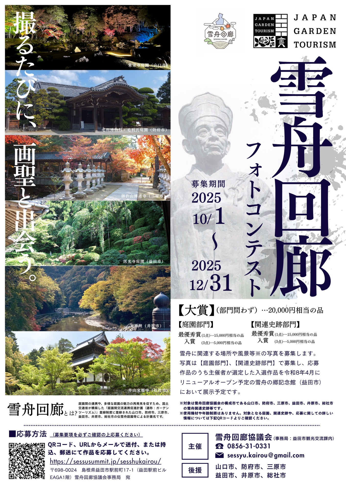 雪舟回廊協議会を構成する6市(益田市、井原市、総社市、三原市、山口市、防府市)の「雪舟に関連する庭園や関連史跡等」を対象にしたフォトコンテストの受付を開始します。